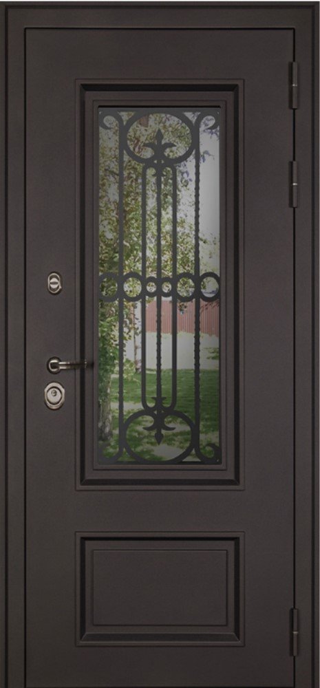 Два слоя покрытия: первый слой - цинкогрунт, второй слой - порошковое покрытие "муар коричневый". Два слоя покрытия. Металлофиленки "Аляска" (2 шт). Тонированный двухкамерный стеклопакет (толщина 3 мм), лазерная резка (рисунок «гранд люкс»)