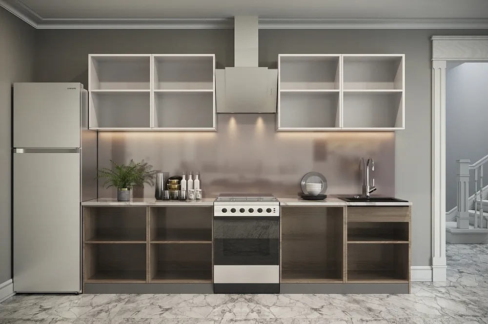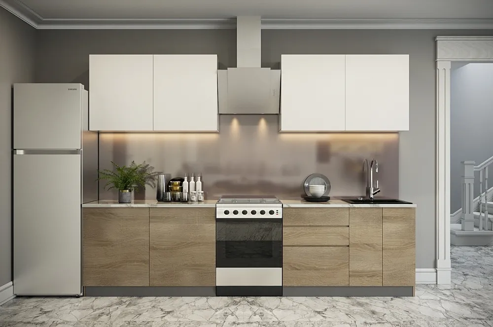 Ручки, столешница, стеновая панель, мойка, смеситель и бытовая техника продаются отдельно.